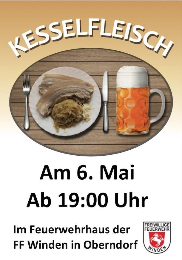 Am heutigen Montag findet ab 19 Uhr das traditionelle Kesselfleischessen der Feuerwehr Winden im Feuerwehrhaus in Oberndorf statt. Es gibt auch Kaffee und Kuchen. Auf zahlreiche Besucher freut sich die Feuerwehr Winden.