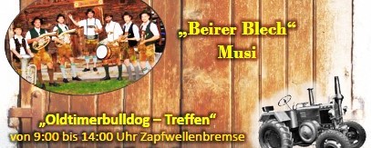 Mit einem absoluten Highlight: Ein Oldtimer-Bulldog-Treffen wartet mit Zapfwellenbremsen-Wettkampf … Und zwar von 9 bis 14 Uhr. Startgebühr: 15 Euro (und eine Maß Festbier geschenkt).