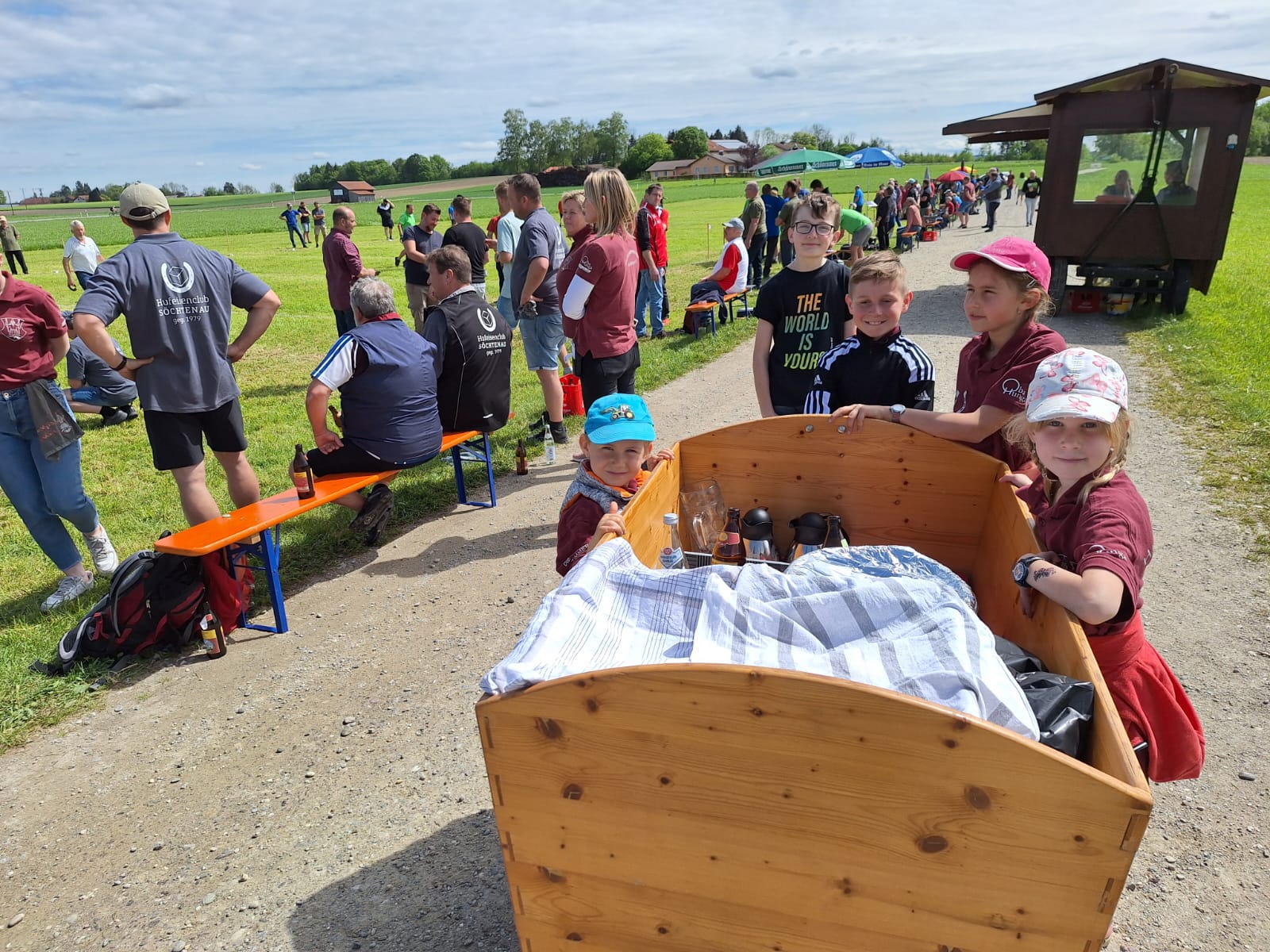 Erst nach zwei Uhr nachmittags waren die Gruppen durch und die Teilnehmer bei schönstem Wetter durchgeschwitzt. Gott sei Dank wurden sie gut versorgt, von den Kolbinger Damen und auch die Kinder zogen mit Feuereifer den mit Wurstsemmeln und Getränken vollbeladenen Wagen – siehe Foto unten.