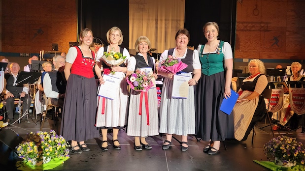 Zum Foto: Simone Dunkel betonte im Zuge der Frühjahrskonzerte freudig, dass Anni Stelzer mit stolzen 70 Jahren dieses Leistungsabzeichen ablegte. Angelika Bernhart und Gerti Schwoshuber begannen ihren musikalischen Werdegang in der damaligen Ü30-Bläserklasse des Musikvereins und bereichern mittlerweile zusätzlich die Musikkapelle.