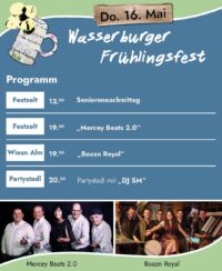Die Stadt Wasserburg lädt heute, ab 13 Uhr, alle Seniorinnen und Senioren ab 70 Jahren aus dem Wasserburger Stadtgebiet auf ein halbes Hendl und eine halbe Bier ein. Für die musikalische Unterhaltung sorgt traditionell die „Stadtkapelle Wasserburg“. „Merci Beats 2.0″ rocken ab 19 Uhr das Festzelt. Die Musiker aus dem Altlandkreis sorgen für spitzen Partystimmung mit ihren kannten Sounds aus den letzten Jahrzehnten.