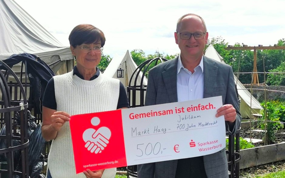 Anlässlich des großen Jubiläums zu 700 Jahren Haager Marktrecht – wir berichteten – hat die Sparkasse Wasserburg für das kulturelle Rahmenprogramm 500 Euro gespendet. Helmut Schuster, Leiter der Sparkassengeschäftsstelle in Haag, überreichte jetzt an Bürgermeisterin Sissi Schätz den Spendenscheck (Foto).
