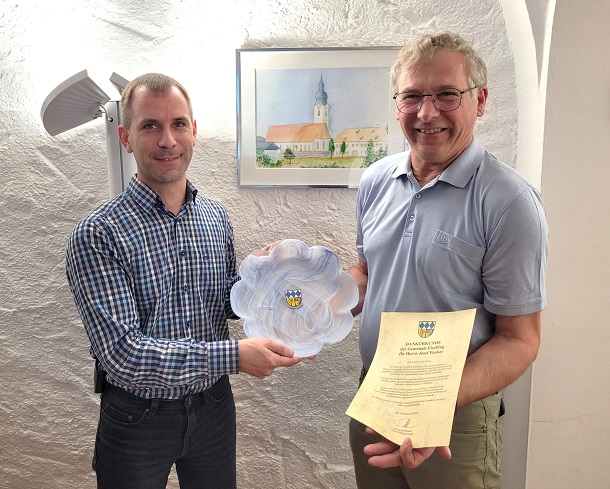 Von Mai 2014 bis einschließlich April 2024 sei Pauker Mitglied des Gemeinderats und in dieser Zeit auch stets Mitglied im gemeindlichen Rechnungsprüfungsausschuss gewesen. Zudem habe er sich von Mai 2020 bis einschließlich April 2024 in der Verbandsversammlung des Zweckverbands zur Wasserversorgung der Schonstetter Gruppe engagiert. „Insbesondere mit seinem beruflichen Hintergrund rund um das Bauwesen ist Josef Pauker immer ein wertvoller und anerkannter Ansprechpartner im Gemeinderat und für die Gemeindeverwaltung gewesen“, betonte Bürgermeister Georg Reinthaler. Sein weit darüber hinaus gehender zusätzlicher ehrenamtlicher Einsatz für die Dorfgemeinschaft sei vorbildhaft.