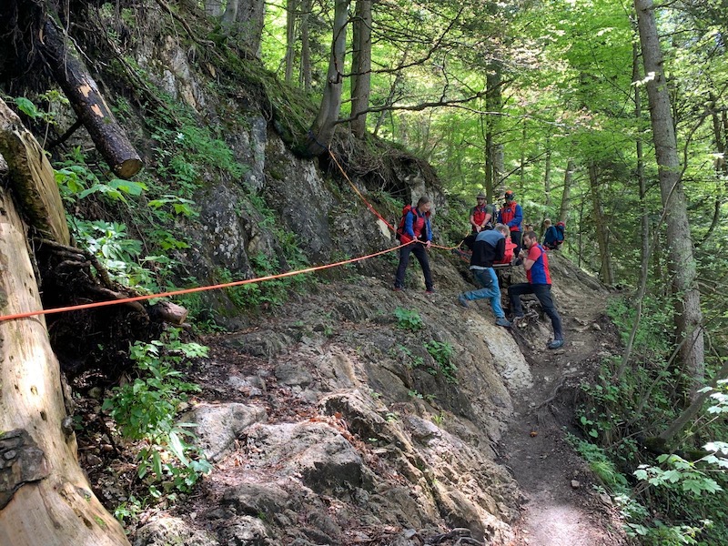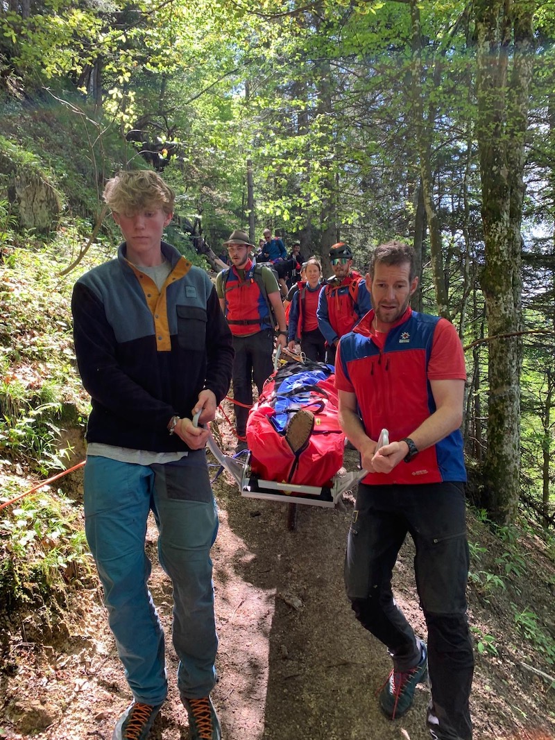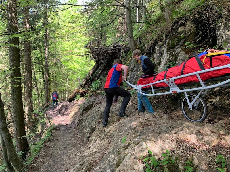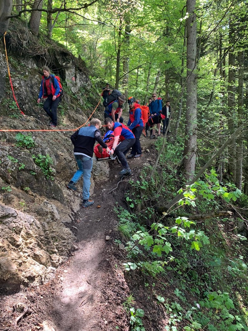 Der Wasserburger Bergwachtnotarzt fuhr unmittelbar von der Übergabe des ersten Patienten wieder Richtung Berg. Zusammen mit fünf Bergwachtlern aus Wasserburg und vier Kollegen aus Aschau transportierten sie den Patienten mit der Gebirgstrage, an einem 60 Meter langen Geländerseil gesichert, bis zur nächsten Forststraße. Sie fuhren den Mann zur Übergabe an den Landrettungsdienst nach Aschau.