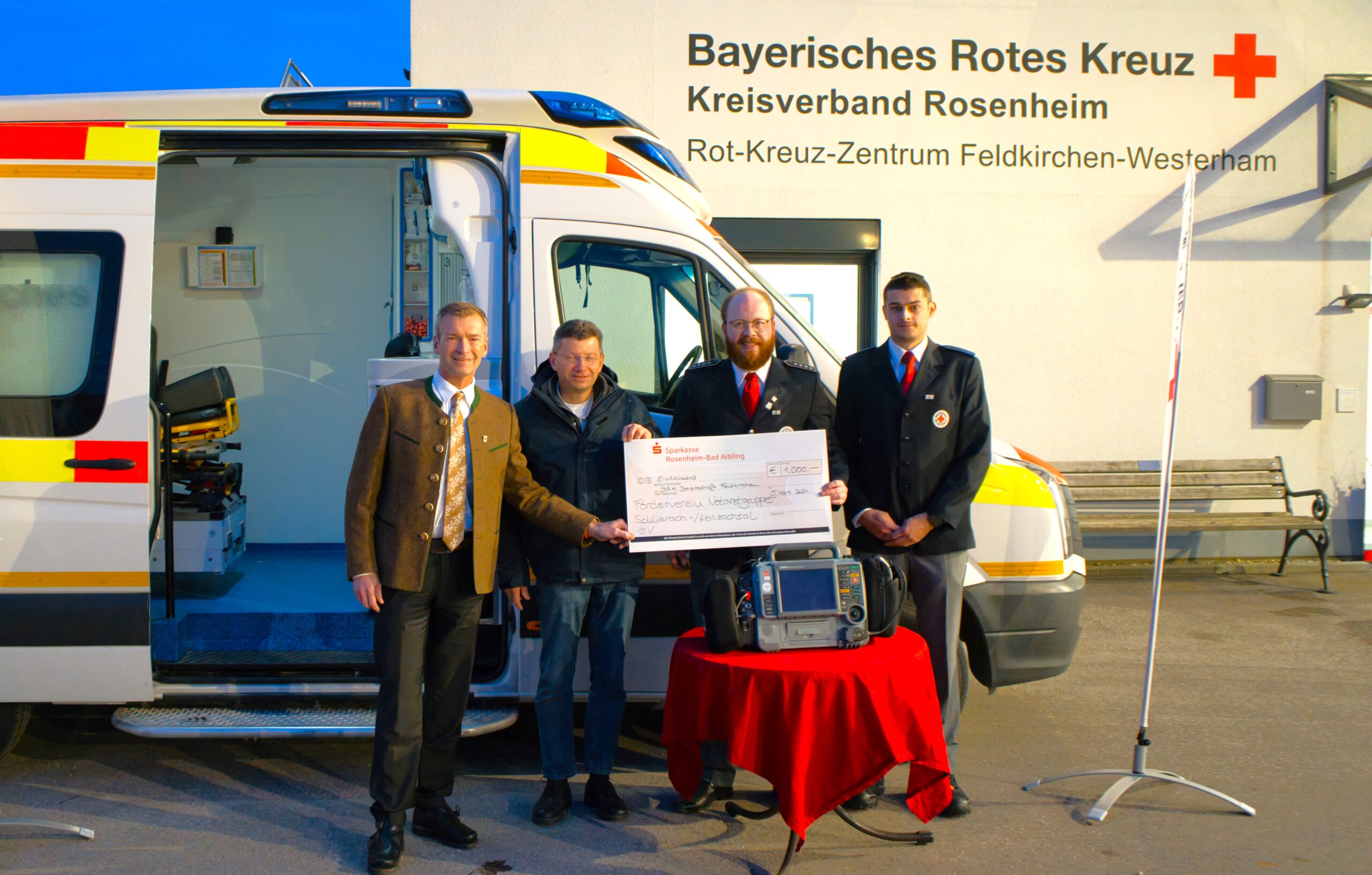 Auch aufgrund dieser besonderen Lage gab’s eine tolle Spende: Der Leiter der BRK-Schnelleinsatzgruppe „SEG Transport Feldkirchen“ und die BRK-Bereitschaftsleitung nahmen jetzt vom Förderverein „Notarztgruppe Schlierach und Leitzachtal e.V.“ 1.000 Euro entgegen. Gedacht für die Finanzierung des bereits angeschafften, gebrauchten LP 15 EKGs der Firma Stryker …