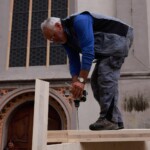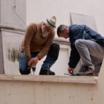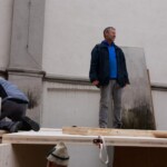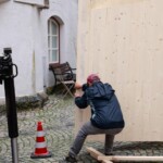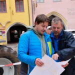 Zahlreiche Hände halfen beim Aufbau mit. Und am Ende konnten Hilmar Henjes (Dritter von links) und Richard Kröff (Zweiter von links) vom Architekturbüro Kröff, auf deren Plänen die Konstruktion basiert, ihr Bauwerk zufrieden in Augenschein nehmen. Die Gesamtleitung für den ersten Baukomplex hatte Theaterkreis-Vorsitzender Sepp Christandl (Zweiter von rechts) inne: „Ich bin froh, dass alles so gut geklappt hat. An ein paar Stellen in der Altstadt wurd’s ein bisschen eng, aber wir sind letztlich gut durchgekommen.“