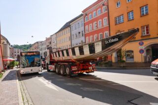Nach dem Unterbau: Heute folgten Transport und Installation der großen Inn-Plätte fürs Bürgerspiel