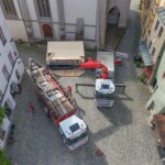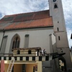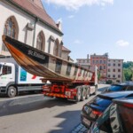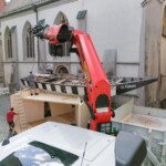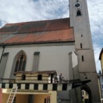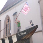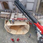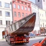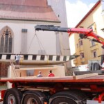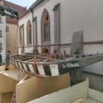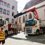 Am Vormittag rollten die Profis Fabian Model und Milos Peter von der Firma Zosseder (Sponsor des Bürgerspiels) mit der tonnenschweren Plätte an. Dann wurde sie mit einem Kran auf die beiden Pylonen gehoben. Nachmittags erhielt die „St. Nikolai“ noch ihren Aufbau.