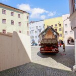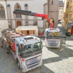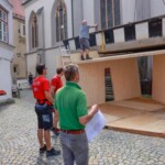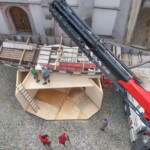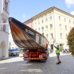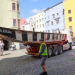 Nach dem Unterbau: Heute folgten Transport und Installation der großen Inn-Plätte fürs Bürgerspiel