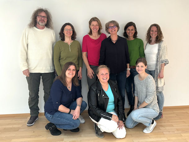 Foto: Das Team des Zentrums Südostoberbayern freut sich über viele Besucher (von links) – Frank Hillebrand (Kinderhospizarbeit), Michaela Jenne-Eiser (Angehörigenberatung), Barbara Haneberg (Leitung Bunter Kreis Rosenheim, Sozialmedizinische Nachsorge), Renate Weininger-Fischer (Zentrumsleitung, Therapeutische Begleitung), Christiane Greinsberger (Kinderhospizarbeit), Christina Schultz (Kinderhospizarbeit); (unten): Nicole Linke (Kinderhospizarbeit), Bernadette Lehner (Sozialmedizinische Nachsorge), Magdalena Mayer (Öffentlichkeitsarbeit).