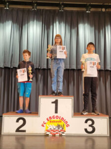 Seit einigen Jahren liefern sich in ihren jeweiligen Altersgruppen Daniel Hepp vom FC Bayern München und Zuzanna Sobczak vom SK Wasserburg ein Binnenduell, bei dem bislang immer Daniel die Nase vorn hatte. Diesmal bekam Zuzanna in der dritten Runde das Bayern-Ass zugelost. Sie konnte einen Bauern als Dorn in die gegnerische Stellung bringen und mit konsequentem Druckspiel die Partie für sich entscheiden. Daniel gewann alle weiteren Partien, doch so auch Zuzanna. Am Siegespodest stand daher Zuzanna ganz oben.