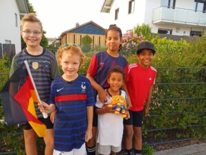 Wie gut, dass morgen Samstag und keine Schule ist. So können auch die kleinen Fußballfans ihre „großen“ Idole fleißig anfeuern. Matthias, Leo, Joshua, Konstantin und Valentin aus Soyen haben sich schon perfekt mit Maskottchen „Albärt“ und Flaggen für das Spiel gegen Schottland ausgestattet und werden mit dem Team um Bundestrainer Julian Nagelsmann kräftig mitfiebern.