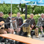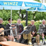 Altbürgermeister Gust Seidinger (mit Hut) freute sich sichtlich, dass sich in Oibich wieder was rührt. Und die Oibichner Musikanten sorgten dafür, dass bei der Bierprobe schon mal die richtige Stimmung herrschte.