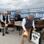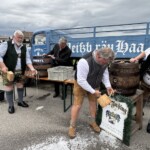 Natürlich durften bei einer Bierprobe die Hauptverantwortlichen, die für das kühle Nass sorgen, nicht fehlen. Aus Haag war Weißbräu Alois Unertl IV. mit von der Partie, aus Forsting Brauereichef Schorsch Lettl. Sie unterstützten die beiden heimischen Politiker beim Anzapfen seelisch und moralisch – was allerdings nicht ganz zum gewünschten Ergebnis führte. Bürgermeister Rudi Schreyer (rechts) verpritschelte einiges vom wertvollen Gerstensaft, ehe der Zapfhahn sicher saß. Landtagsabgeordneter Sebastian Friesinger glaubte sich zunächst im Vorteil und grinste zufrieden zum Bürgermeister rüber, musste dann aber feststellen, dass auch sein Zapfhahn mächtig wackelte und einer Dichtigkeitsprüfung nicht standhielt. Die Brauereichefs sorgten dann souverän dafür, dass kein Tropfen mehr verloren ging.