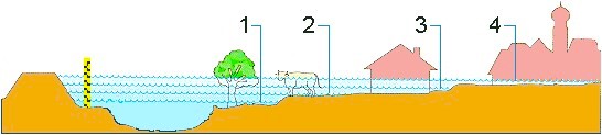 Das jeweilige Ausmaß der Überflutung wird durch vier Meldestufen beschrieben: