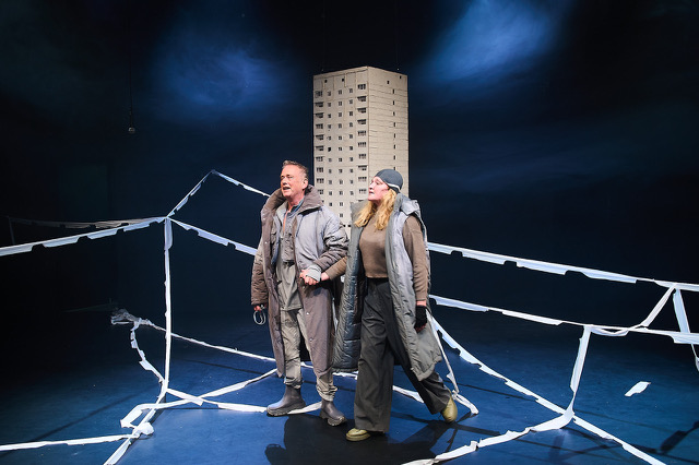 Der Mann möchte fliehen und sagt das auch laut, die Frau zögert, doch auch sie spürt, dass es aus dieser Situation wohl keinen Ausweg gibt. Welche Reaktion auf die herannahende Kugel ist möglich? Doch man sieht sie nicht, diese Bedrohung, das macht alles nur noch schwerer. Und sie sprechen beide über Sprache und was Sprache alles anzurichten vermag: Da werden Begriffe wie „Kontrollmechanismus“, „Endsieg“, „Spezialoperation“ geprägt, die doch nur dazu dienen, die Katastrophe sprachlich zu verklären. Begriffe wie „absolut“, „total“, „100%ig“, „endgültig“, „umerziehen“, „reinigen“ oder gar „erbarmungslose Entschlossenheit“ kündeten nur von der großen Gefahr, in der wir alle steckten.