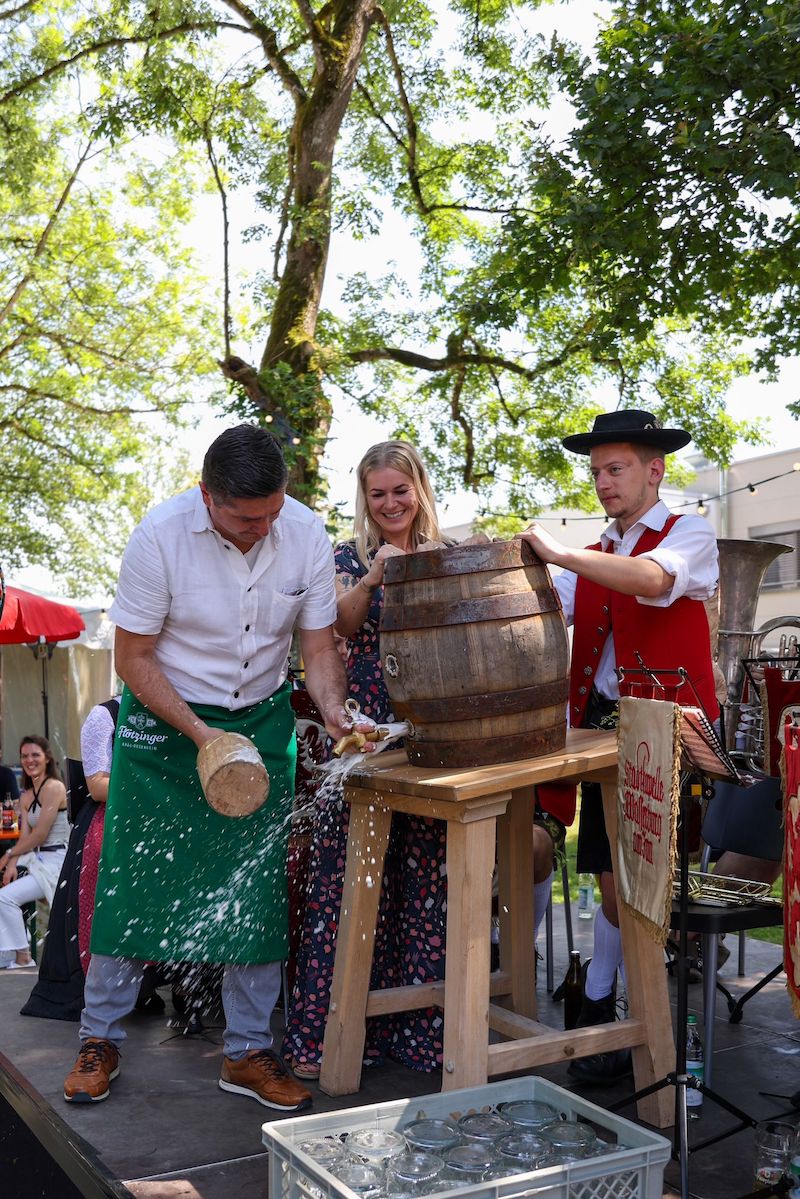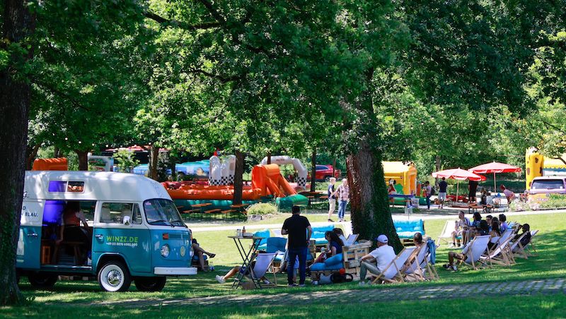Unter schattenspendenden Bäumen luden Lounge-Möbel zum Entspannen ein, während ein Weißbierkarussell und die Klänge der Wasserburger Stadtkapelle für festliche Stimmung sorgten. Für die kleinen Gäste war ein riesiger Spielparcours aufgebaut. Bei strahlendem Sonnenschein genossen die Besucher kühle Getränke und selbst mitgebrachten, leckeren Kuchen.