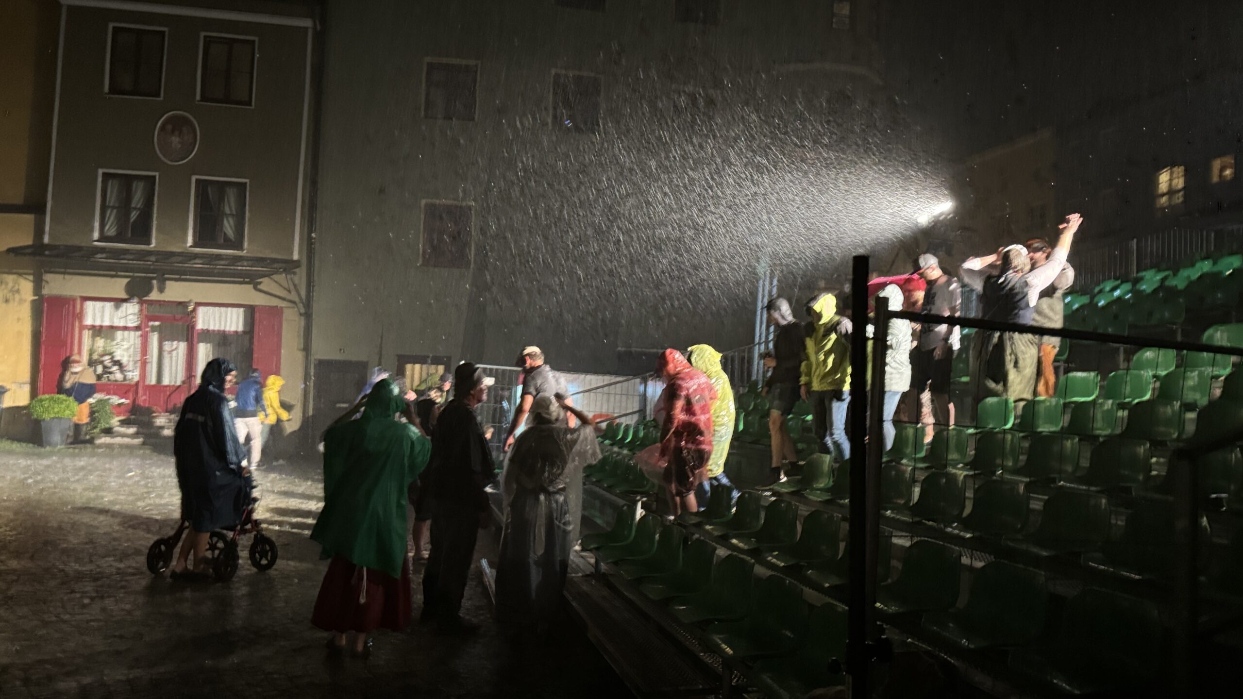 „Ja, leck“, das war der letzte Satz, den der große Wasserburger Handelsherr Gumpelzheimer beim Bürgerspiel am Freitagabend ins Mikrofon sprach, dann war Schluss. Organisationsleiter Sepp Christandl brach die Vorstellung bei den ersten Regentropfen ab. Keine Minute zu früh. Denn nur kurze Zeit später ging quasi die Welt unter. Starkwind, Starkregen, Hagel. Als es am schlimmsten war, waren Bühne und Tribüne zum Glück zum Großteil geräumt. Bereits eine Stunde vorher war alles vorbereitet worden, um Besucher und Darsteller schnell und sicher unter die Arkaden in der Herrengasse und ins Rathaus zu befördern.