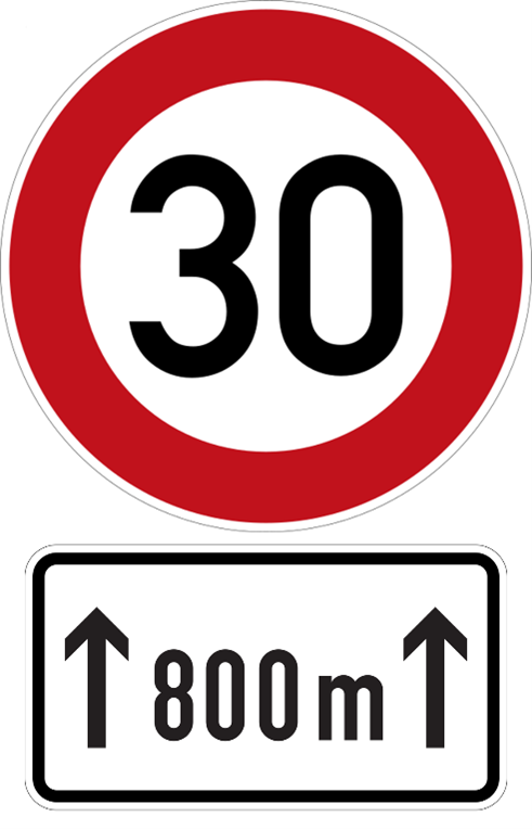 Das Verkehrszeichen für die zulässige Höchstgeschwindigkeit kann durch verschiedene Zusatzzeichen ergänzt werden. Unter anderem ist die Kombination mit dem Zeichen 1001-30 „auf…m“ möglich. Nach dem Abfahren der auf dem Zusatzzeichen angegebenen Distanz ist die Geschwindigkeitsbegrenzung ebenfalls aufgehoben.