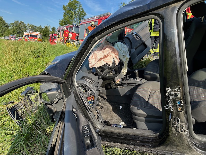 Der VW der 24-jährigen wurde durch die Wucht des Zusammenstoßes von der Fahrbahn geschleudert. Die Fahrerin wurde dabei im Fahrzeug eingeklemmt und musste durch die Feuerwehr befreit werden. Sie wurde schwerverletzt mit dem Rettungshubschrauber ins Krankenhaus geflogen. Am Fahrzeug entstand Totalschaden in Höhe von rund 10.000 Euro.
