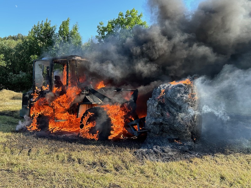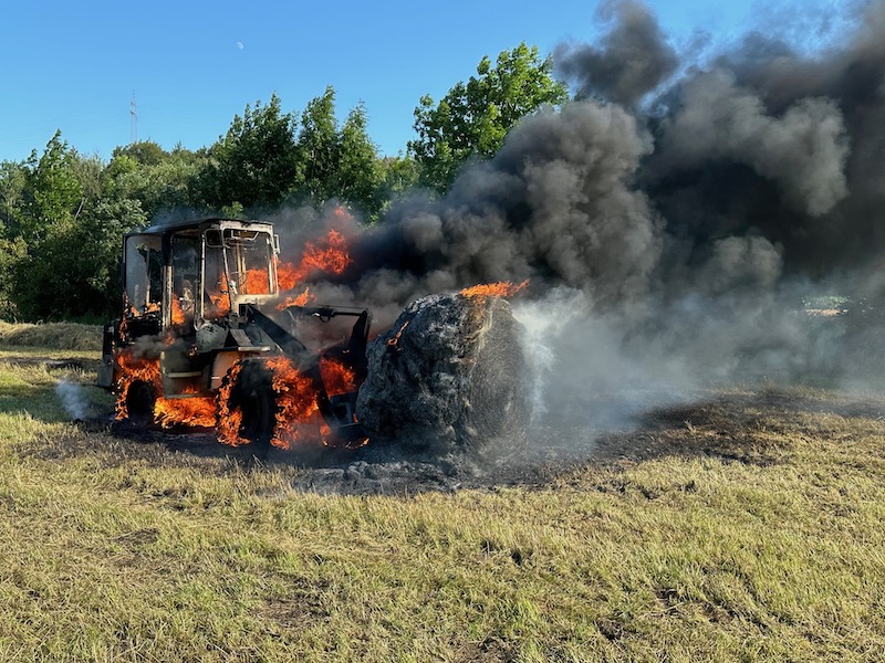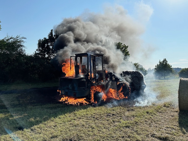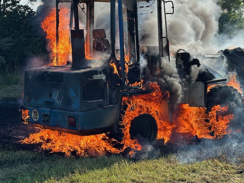 Alarm für die Feuerwehren Albaching und St. Christoph am späten Montagnachmittag: Die Floriansjünger rückten gegen 18 Uhr zum Weiler Untermeierhof aus. Dort stand auf einem Feld ein Radlader lichterloh in Flammen. Über die Brandursache ist noch nichts bekannt. Das Fahrzeug wurde völlig zerstört. Verletzt wurde zum Glück niemand. Fotos: Georg Barth.