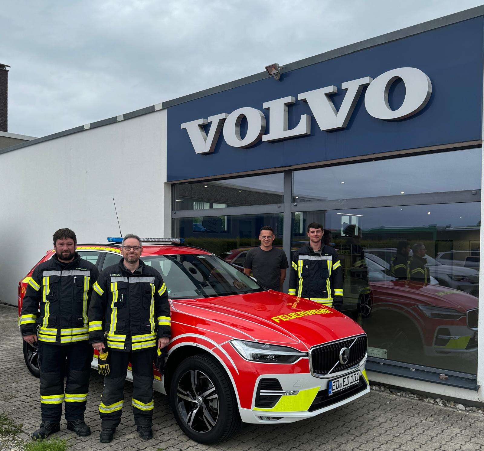 PR – Zuverlässig, modern, mit allem ausgestattet, was man für eine schnelle und sichere Anfahrt unter Einsatzbedingungen braucht: Die Feuerwehr Erding freut sich über einen neuen Kommandowagen, einen XC60 von Svenscar Haag. Den übergab dieser Tage der Leiter der Haager Svenscar-Niederlassung, Benjamin Geiger (Zweiter von rechts), an die Floriansjünger aus dem Nachbarlandkreis.