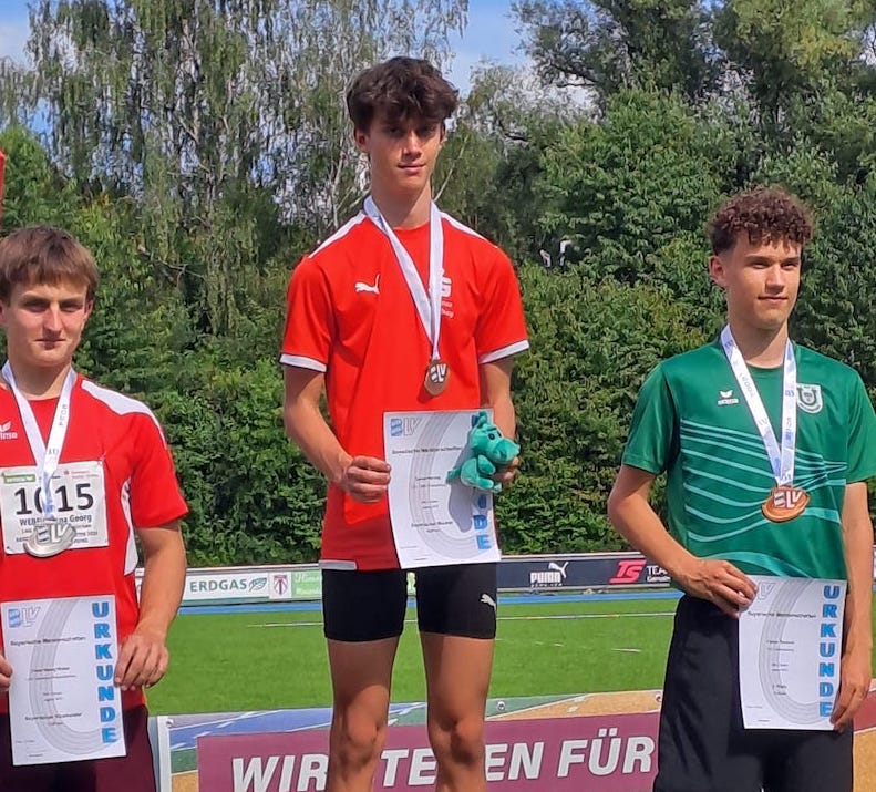 Gleich drei Hammerwerfer wurden bayerischer Vizemeister. Milo Seidinger holte mit 27,14 Metern die Silbermedaille in der M14. Er musste sich lediglich Simon Stiastny von SpVgg. Auerbach Streitheim geschlagen geben, der 31,05m warf. Damit liegt Milo im familieninternen Duell einen Platz vor Rocco der in der U20 Vizemeister wurde.