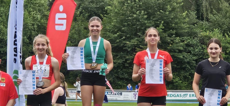 Mit zwei Vizemeistertitel war Laura Dirnecker (W14 – Bild unten ganz links) die erfolgreichste Wasserburger Teilnehmerin. Im Stabhochsprung musste sie sich nur ihrer Dauerkonkurrentin Emilia Scheffczik geschlagen geben, die mit 3,15 Metern zehn Zentimeter mehr überquerte.
