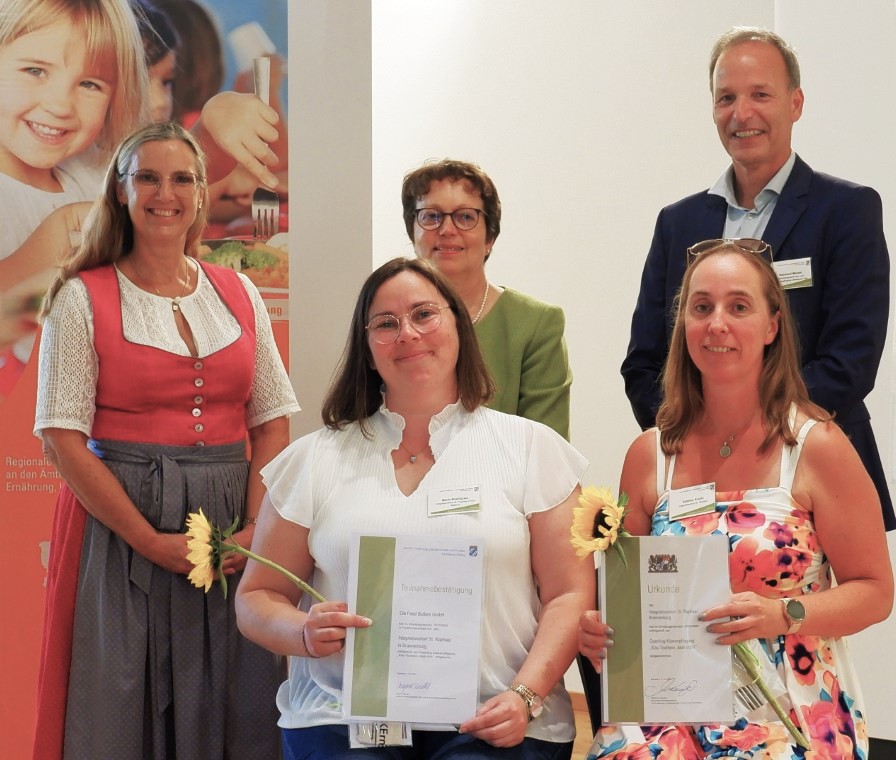 Im Bild hinten stehend von links: Martina Fink (Coach), Irmgard Reischl (Leiterin Vernetzungsstelle Kita- und Schulverpflegung), Reinhard Menzel (Behördenleiter Amt für Ernährung, Landwirtschaft und Forsten),