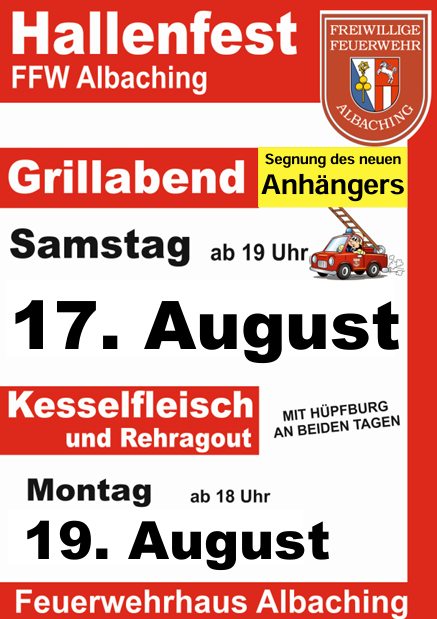 Eine Segnung des neuen Feuerwehr-Anhängers in Albaching: Sie findet nächste Woche am Samstag, 17. August, beim traditionellen Hallenfest (ab 19 Uhr) statt. Gegen 20.15 Uhr wird das neue Fahrzeug von Pfarrer Lekan und Frater Emanuel gesegnet werden.