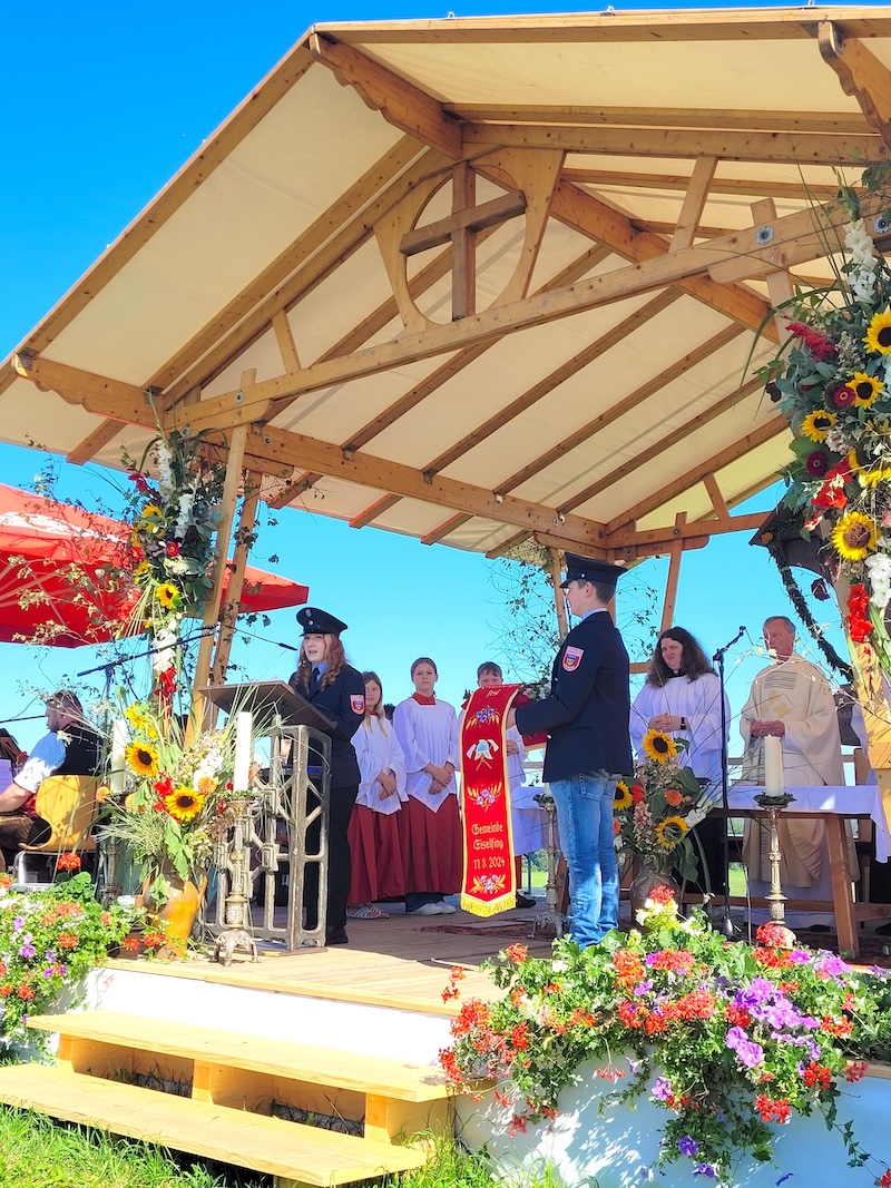 Pater Anton Dimpflmaier hob im Rahmen des Festgottesdienstes unter freiem Himmel oberhalb der Festhalle in Spielberg den besonderen Stellenwert der selbstlosen Hilfe von Feuerwehrleuten hervor: „Euer Einsatz bei Bränden oder etwa Verkehrsunfällen ist immer auch ein ganz persönlicher Gottesdienst, der Mitmenschen in Not neue Hoffnung und Kraft schenken kann. Getreu eurem Motto Gott zur Ehr´, dem Nächsten zur Wehr.“ Schließlich weihte er noch das neue Fahnenband der Feuerwehr.
