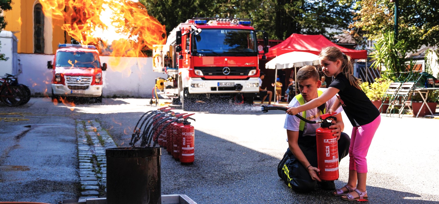 Natürlich durfte bei den hochsommerlichen Temperaturen weder die obligatorische Wasserschlacht noch eine ordentliche Brotzeit mit Würstl-Semmeln fehlen. Und so hörte man nach einem rundum gelungenen Tag mehrfach: „Wenn ich groß bin, dann geh ich auch zur Feuerwehr.“