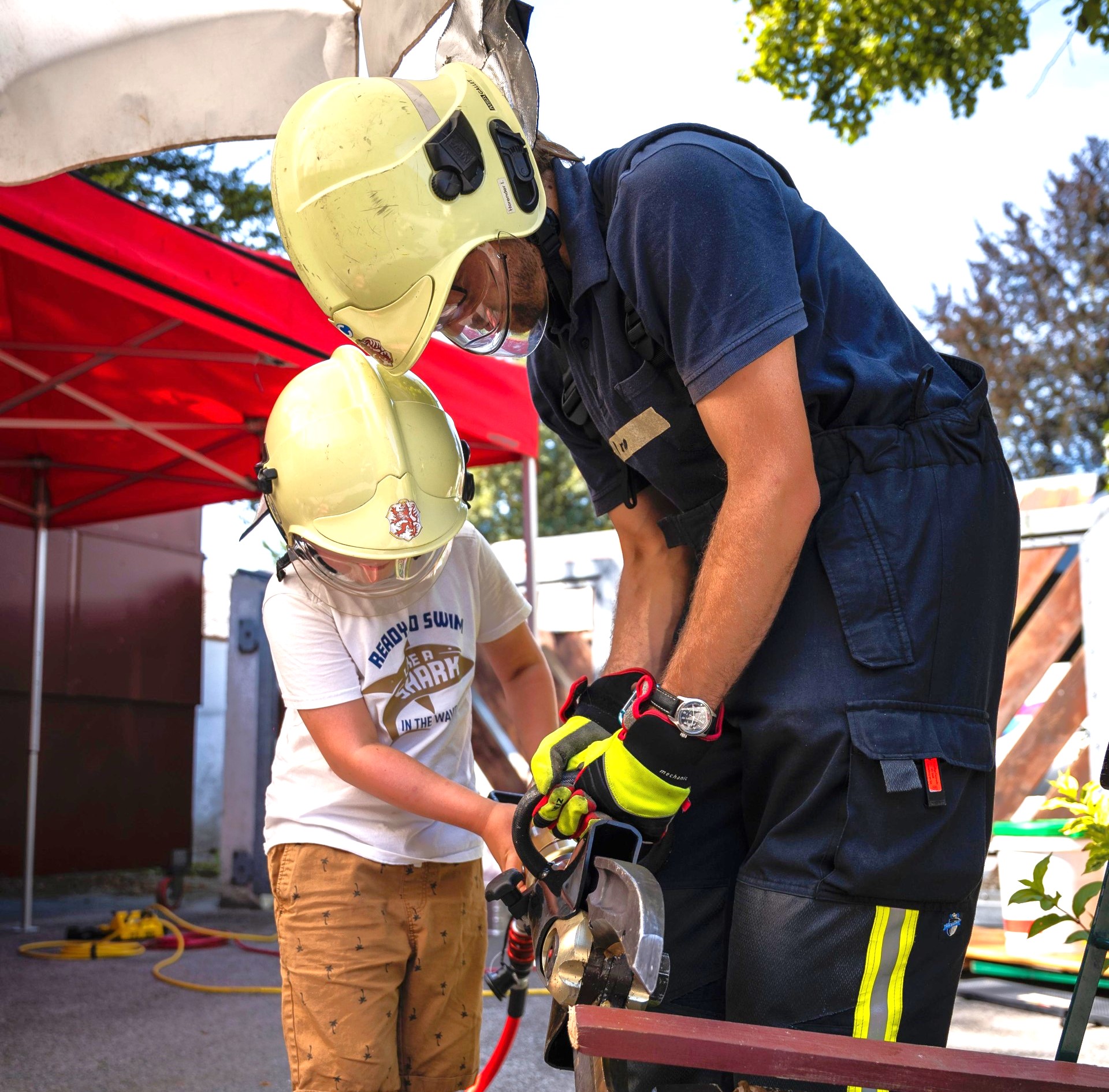 Sie ließen die Kinder das Gerätehaus und die Feuerwehr-Fahrzeuge sowie deren Gerätschaften erkunden. Die Begeisterung der Kinder war sichtlich groß – die zukünftigen Feuerwehrler hatten viele Fragen, die natürlich umgehend und gerne von den erfahrenen Einsatzkräften beantwortet wurden.