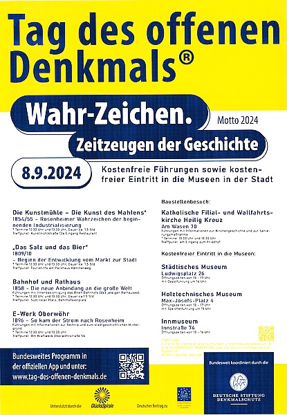 Zum „Tag des offenen Denkmals“ am 8. September – wir berichteten – bietet auch die Stadt Rosenheim kostenlose Führungen sowie freien Eintritt in drei Museen an. Die Führungen müssen über die Touristinfo Rosenheim gebucht werden, da die Teilnehmerzahl begrenzt ist.