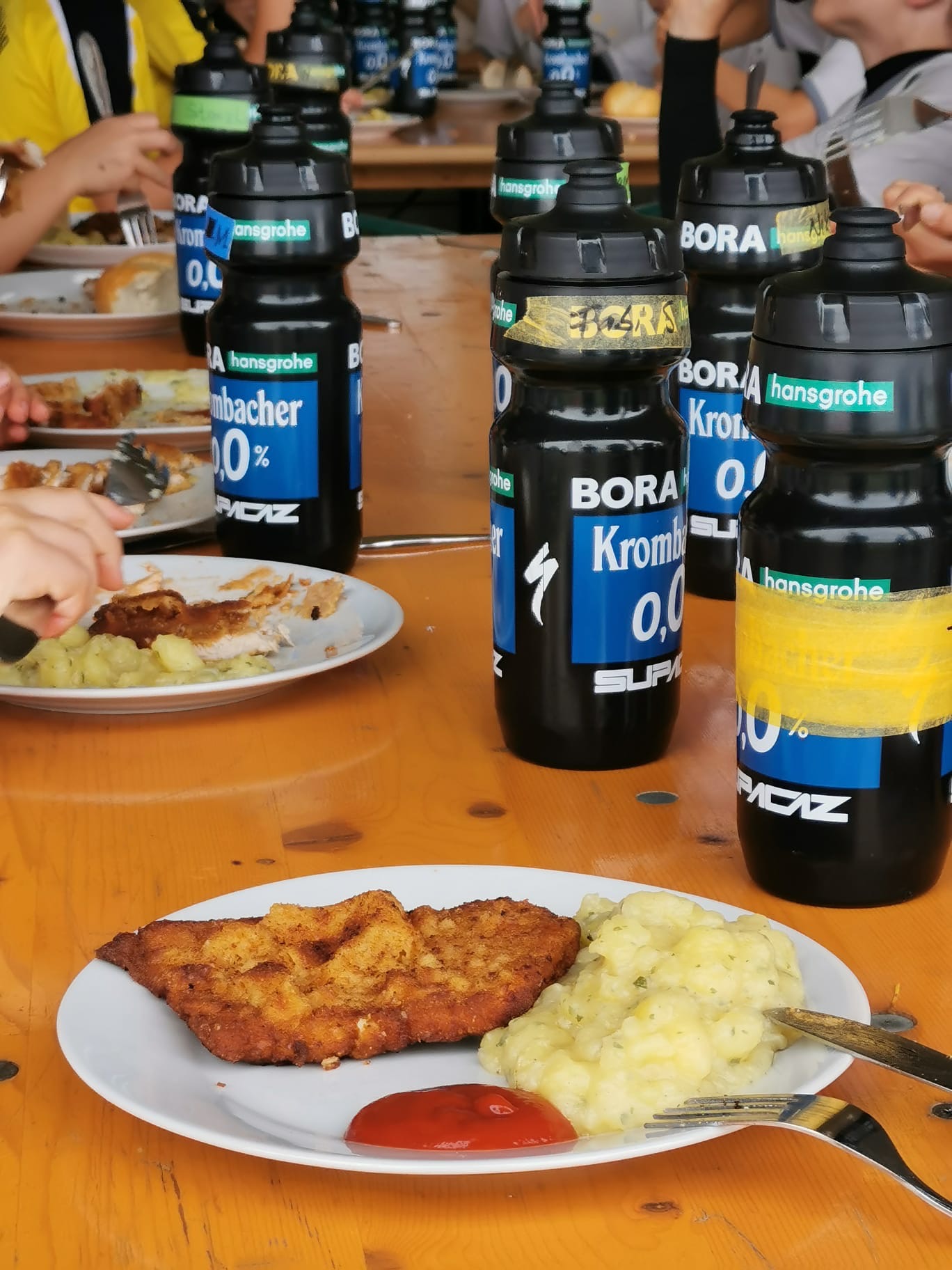 In der Mittagspause genossen die Kinder ein leckeres Schnitzel mit Kartoffelsalat und frischem Salat. Im Anschluss daran verbrachten sie die Pause draußen beim freien Spiel. Zur Erfrischung gab es Obst und Eis, was bei den sommerlichen Temperaturen sehr willkommen war.