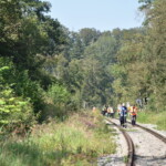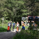 Der Einsatz ist aufgrund des unwegsamen Geländes im Wald schwierig. Die 45 Insassen des Zuges haben diesen aber bereits verlassen können und werden nun per Bus weitertransportiert.
