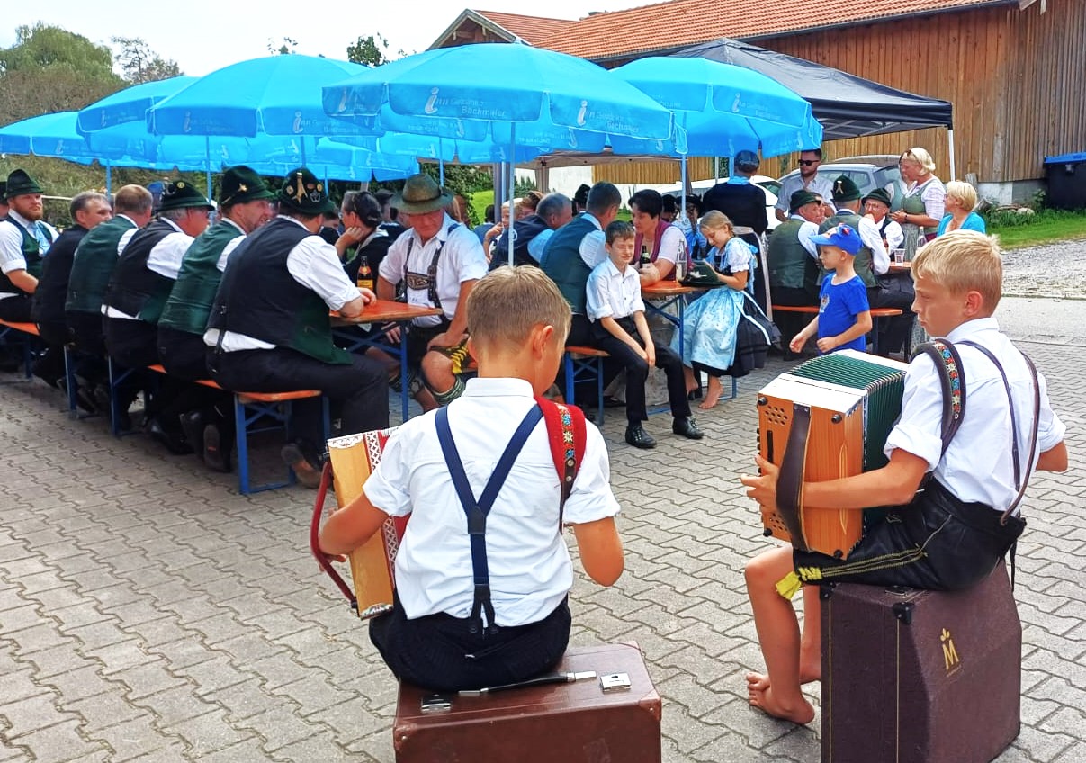 Feierlich umrahmt wurde der Gottesdienst von den Griesstätter Sängerinnen Johanna und Julia und von den jungen Ziach-Spielern Lorenz und Leonhard und vom Öttl Franz. Und danach traf man sich gemütlich im Freien zum Frühschoppen beim Schuster Schorsch und Andrea (Bild unten) …