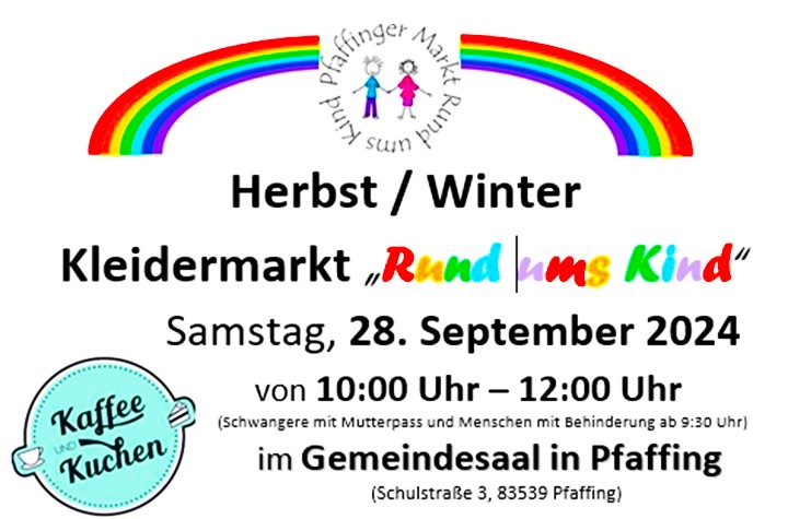 Der beliebte Kinderkleidermarkt in Pfaffing findet nächste Woche am Samstag, 28. September, von 10 bis 12 Uhr statt – und zwar diesmal wieder im Gemeindesaal in Pfaffing. Der Erlös des Kleidermarktes kommt den Büchereien in Pfaffing und Ramerberg zugute. Mit den Einnahmen sollen neue Kinder- und Jugendbücher sowie Tonies angeschafft werden, um das Angebot für die Kleinen und jungen Lesern zu erweitern.