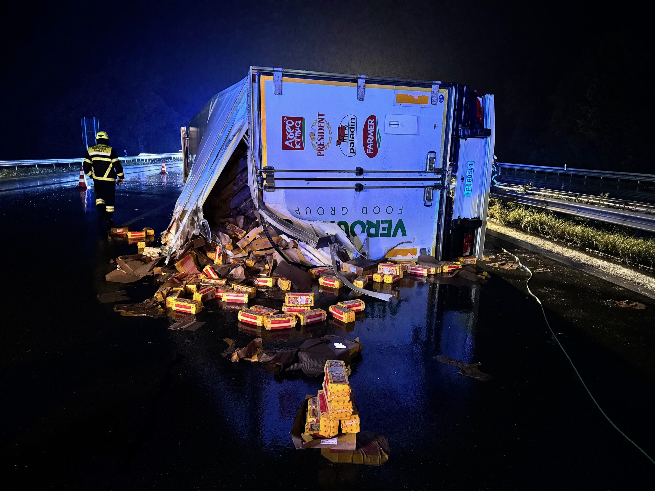 Am Sattelzug entstand durch den Unfall ein Totalschaden, auch Teile der Käse- und Toast-Ladung wurden auf die Fahrbahn verteilt.