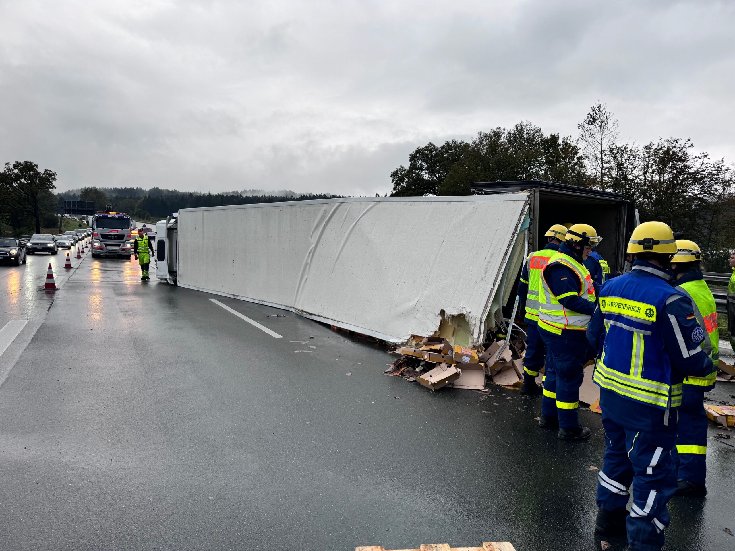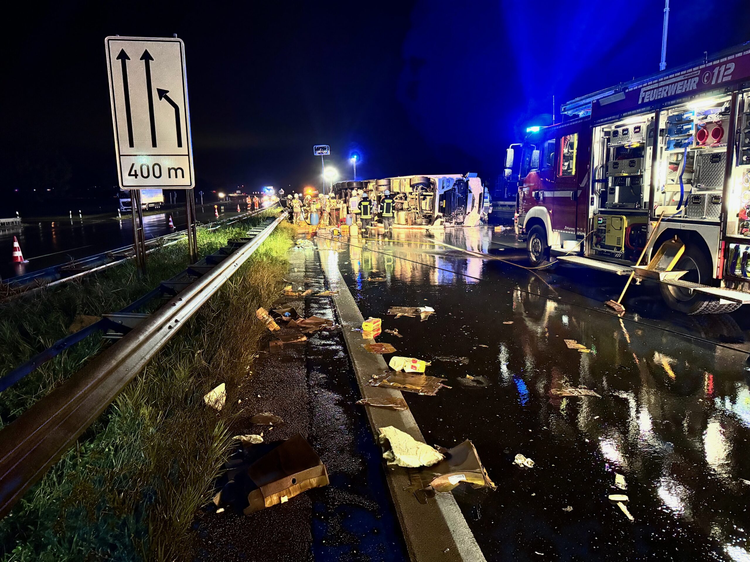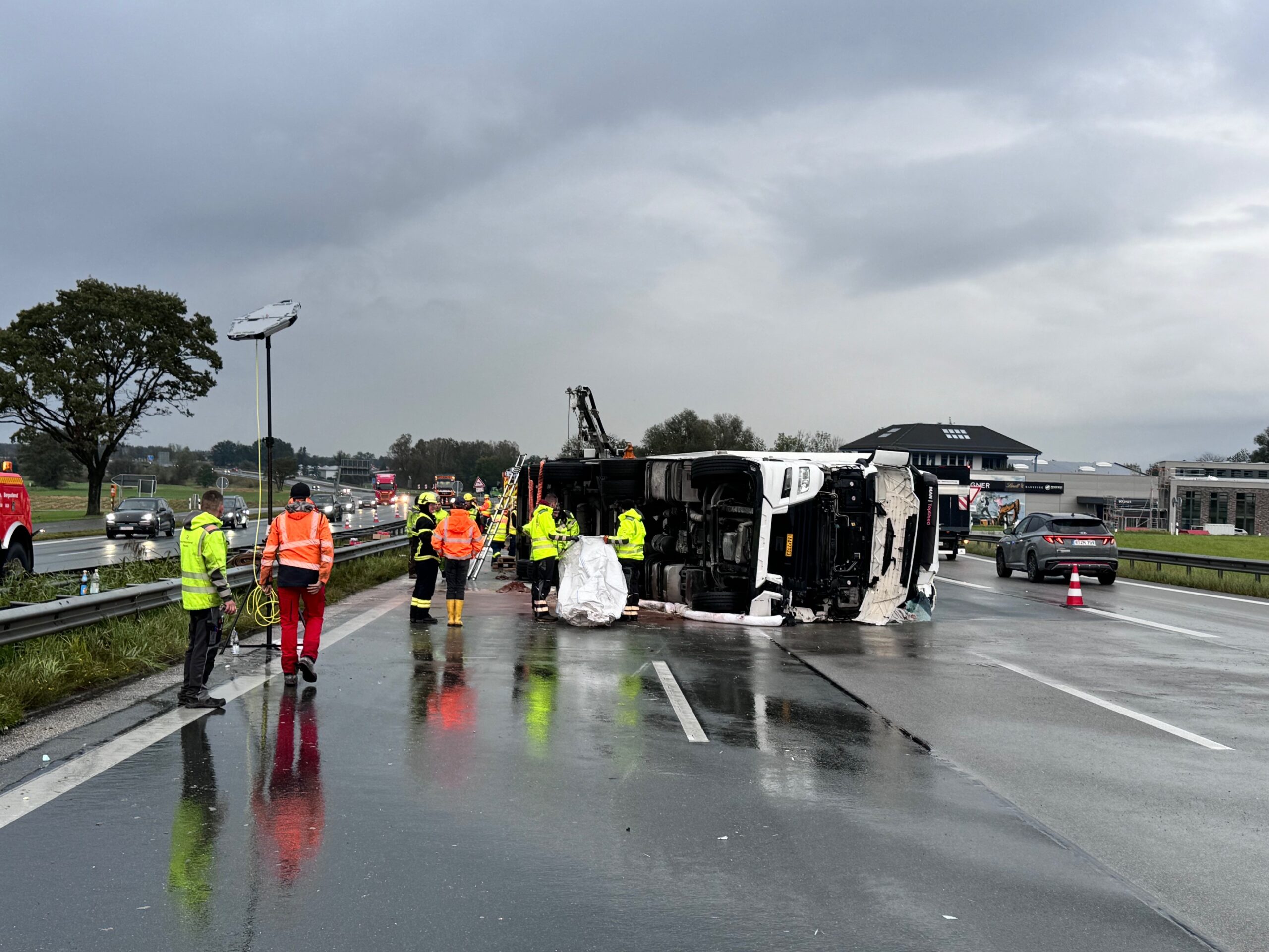 Der Laster blieb auf der Fahrerseite liegen und blockierte die linke und die mittlere Fahrspur. Der Grieche hatte Glück im Unglück – er wurde nur leicht verletzt.