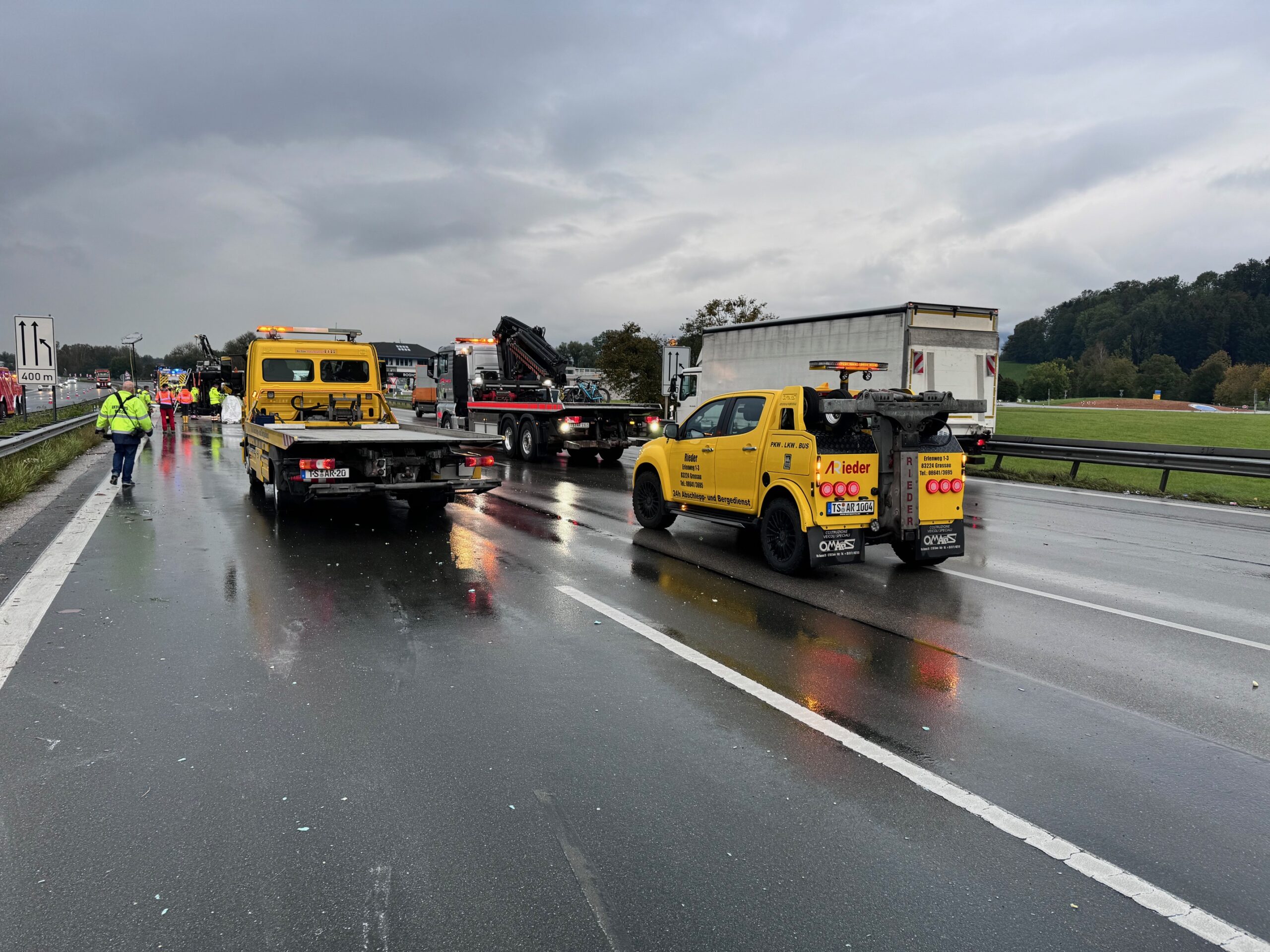 Momentan wird der Verkehr in Richtung Salzburg über die Ausfädelungsspur der Anschlussstelle Bernau an der Unfallstelle vorbeigeleitet. In Fahrtrichtung München ist der linke von drei Fahrstreifen gesperrt. Zur Bergung des Lasters ist vermutlich eine Vollsperre in Richtung Salzburg notwendig …