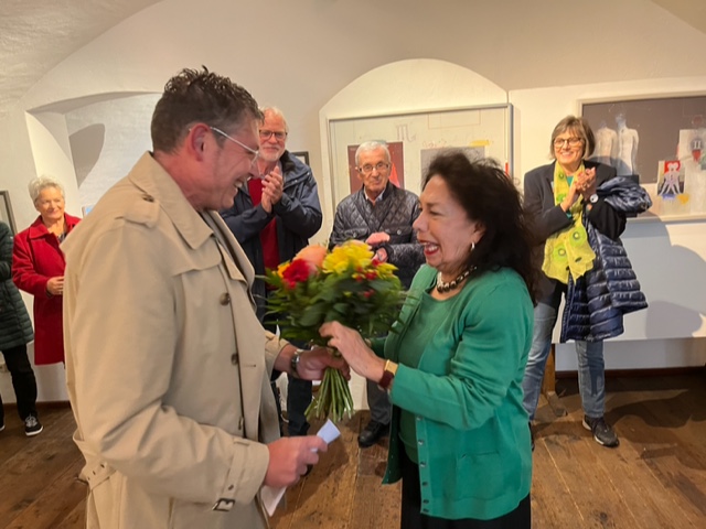 Da der Tag der Ausstellungseröffnung zeitgleich der Geburtstag von Patrizia Reichert, der Gattin des Künstlers, sei, ließ er es sich nicht nehmen, mit den Anwesenden gemeinsam ein kleines Ständchen zu singen und der Jubilarin einen Blumenstrauß zu überreichen.