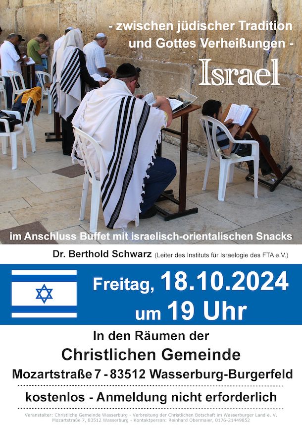 Am Freitag, 18. Oktober, findet in der christlichen Gemeinde Wasserburg in der Mozartstraße ab 19Uhr ein evangelistischer Vortrag statt. Der Vortrag von Dr. Berthold Schwarz befasst sich mit dem Thema der jüdischen Tradition und den Verheißungen Gottes, basierend auf dem Wort Gottes, der Bibel. Wichtig: es wird keine politische Veranstaltung sein, daher werden auch keine politischen Fragen behandelt.