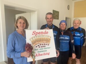 Auch eine Abordnung des Vereins „Schellen-Sau“ aus Wasserburg folgte der Einladung und radelte nach Albaching. Der Gartenbauverein hatte beim Pflanzentausch mit Spenden und Kuchenverkauf einen Betrag von 500 Euro erhalten. Bewusst wählte der Verein diese gemeinnützige sportliche Truppe, weil sie sich hauptsächlich für bedürftige Kinder im Raum Wasserburg einsetzt. Die „Schellen-Sau“-Abordnung freute sich sehr und nahm die Spende dankend entgegen.