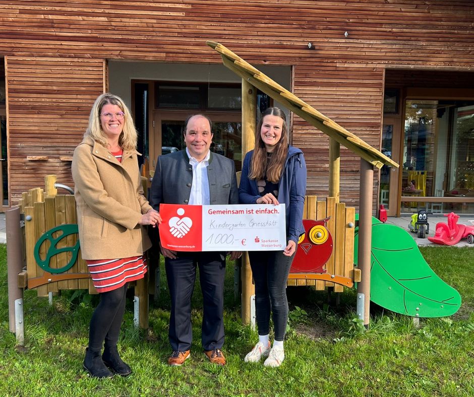 Thomas Schuster, der stellvertretende Leiter der Sparkassen-Geschäftsstelle in Halfing, überreichte dazu gerne einen Spendenscheck über 1.000 Euro an die Leiterin und an Lea Pecher, die Fachbereichsleiterin Krippe. Sie bedankten sich für die Spende der Sparkasse Wasserburg herzlich und betonten dabei, wie wichtig Spielgeräte seien, die speziell auf die Bedürfnisse der Kinder zugeschnitten seien.