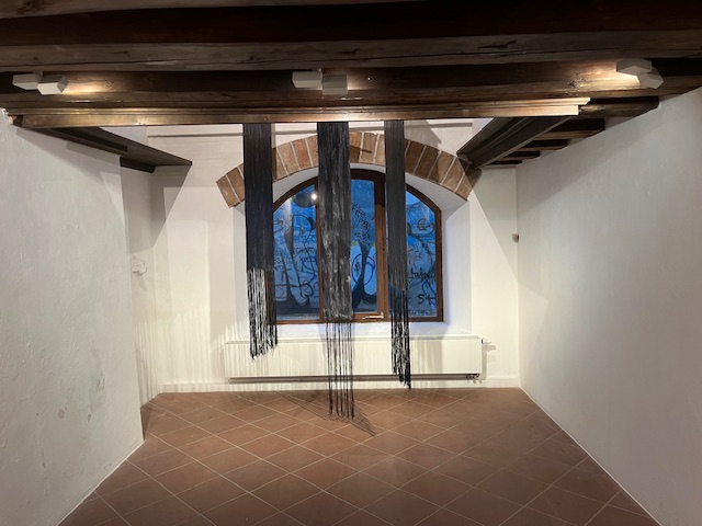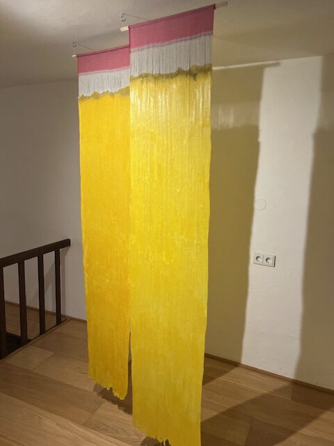 In dem Bereich im Erdgeschoss, in dem die Ausstellung eröffnet wurde, hängen teppichartige Wachsvorhänge in verschiedenen Farben. Utta Kasparekt nennt diese Installation: „Dein goldenes Haar, Margarethe“.