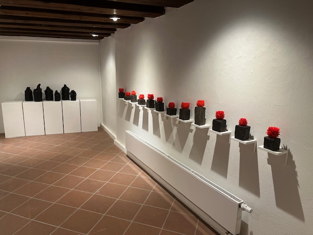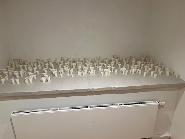 Geht man im Ganserhaus in den ersten Stock, entdeckt man in einem Raum zahllose kleine Gefäße aus Porzellan, die einen auch an Korallen erinnern könnten. Der Raum, von der Installation dieser Gefäße dominiert, strahlt Ruhe und Bewegung in einem aus. Nanette Weichmann hat hier nach dem katastrophalen Brand in ihrer Werkstatt vor über einem Jahr wieder etwas gestaltet, das Leben und Zuversicht auszustrahlen vermag. Sie selbst nennt ihre Installation „Bleiche“.