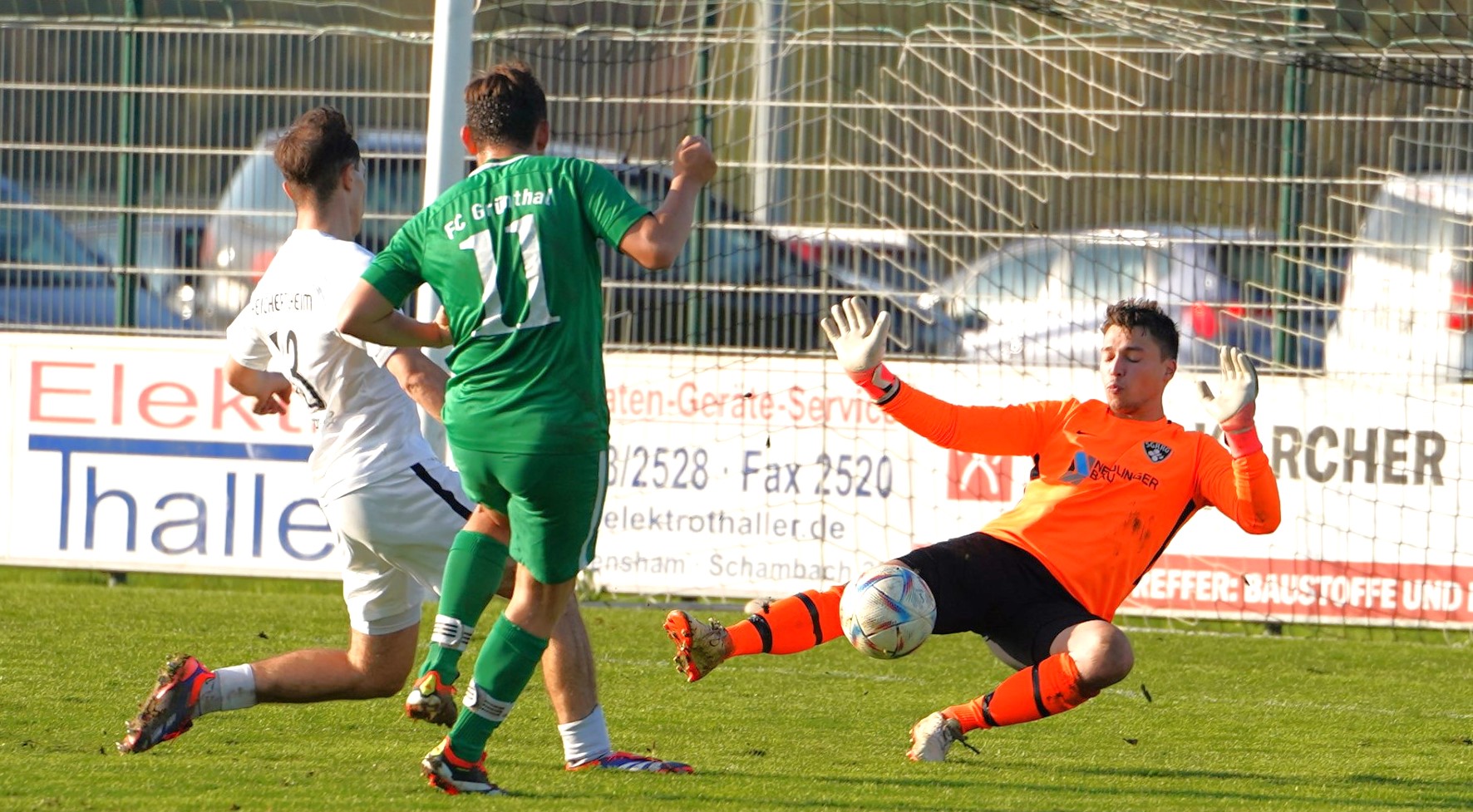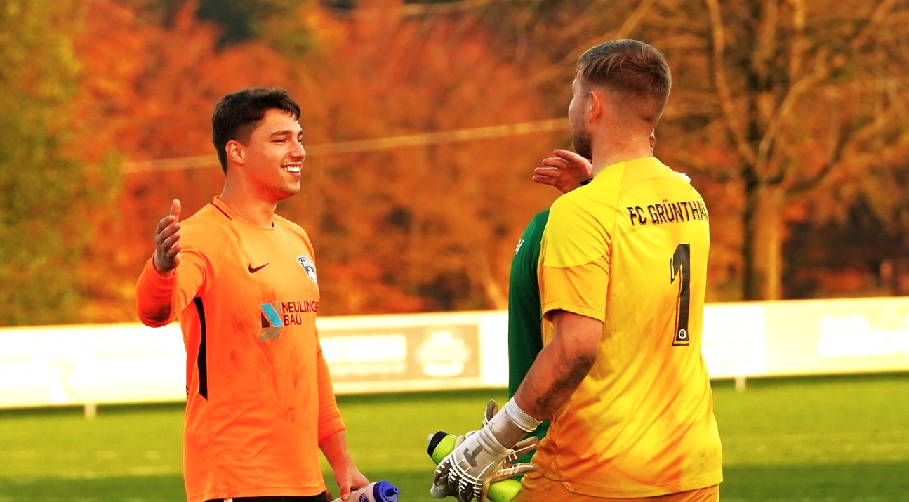 Unser Sport-Foto zum Tage: Beide Goalies hatten am Ende gut schmunzeln mit einer schönen, fairen Geste – der SG-Keeper Ian-Luca Fischer (links) und der Grünthaler Stephan Kumpfmüller (rechts).