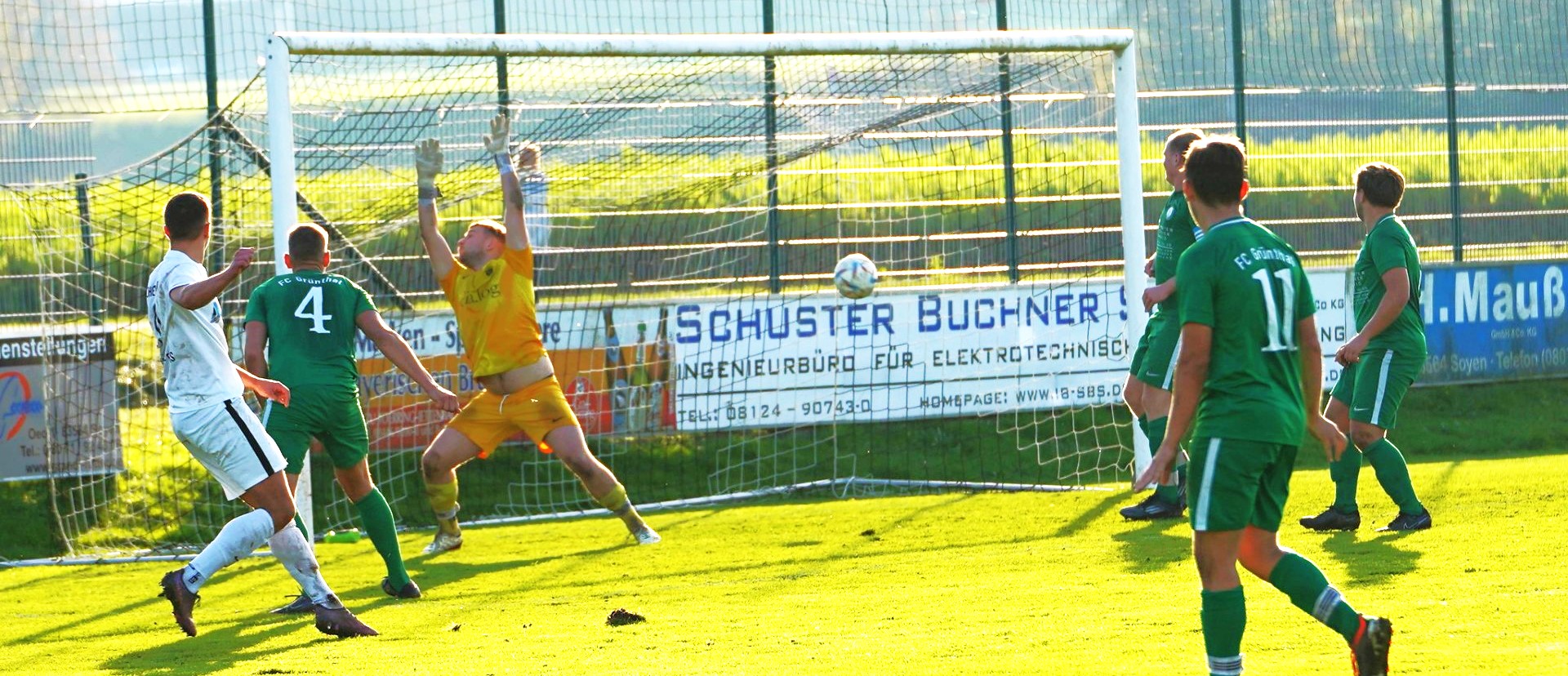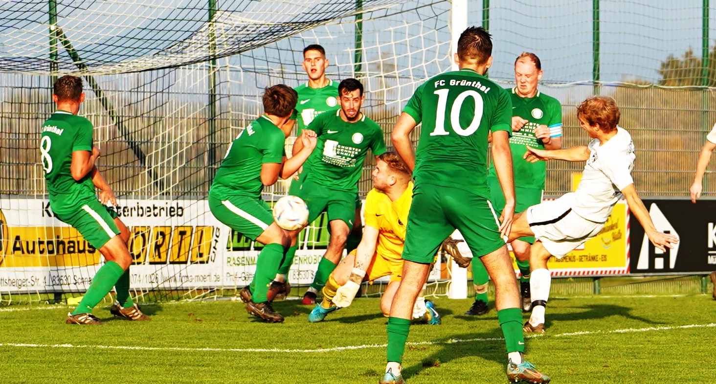 Nach dem 3:0-Erfolg gegen den SV Söchtenau-Krottenmühl, bei dem die Spielgemeinschaft trotz Sieges mit der eigenen Leistung nicht so ganz einverstanden war, wollte die SG im Derby beim FC Grünthal von Anfang an ein anderes Gesicht zeigen. So starteten die Gäste mit viel Energie in die Partie und nach nicht einmal 45 Sekunden hatte Albert Schaberl bereits den Führungstreffer auf dem Fuß, sein Versuch wurde jedoch noch im letzten Moment geblockt und der Nachschuss von Michael Vital landete über dem Gehäuse (1.).