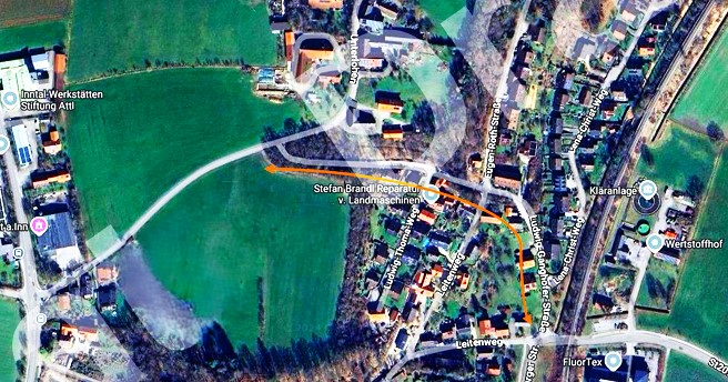 Unteschiedliche Meinungen gibt es zur Ludwig-Ganghofer-Straße in Rott – siehe Karte oranger Pfeil: Bei der letzten Verkehrsschau vor genau einem Jahr war die Gemeinde Rott auf das Entfernen der dortigen Geschwindigkeits-Begrenzung von 30 km/h und der Tonnenbeschränkung von 3,5 t mit dem Zusatzzeichen „Landwirtschaftlicher Verkehr frei“ von Landratsamt und Polizei hingewiesen worden.